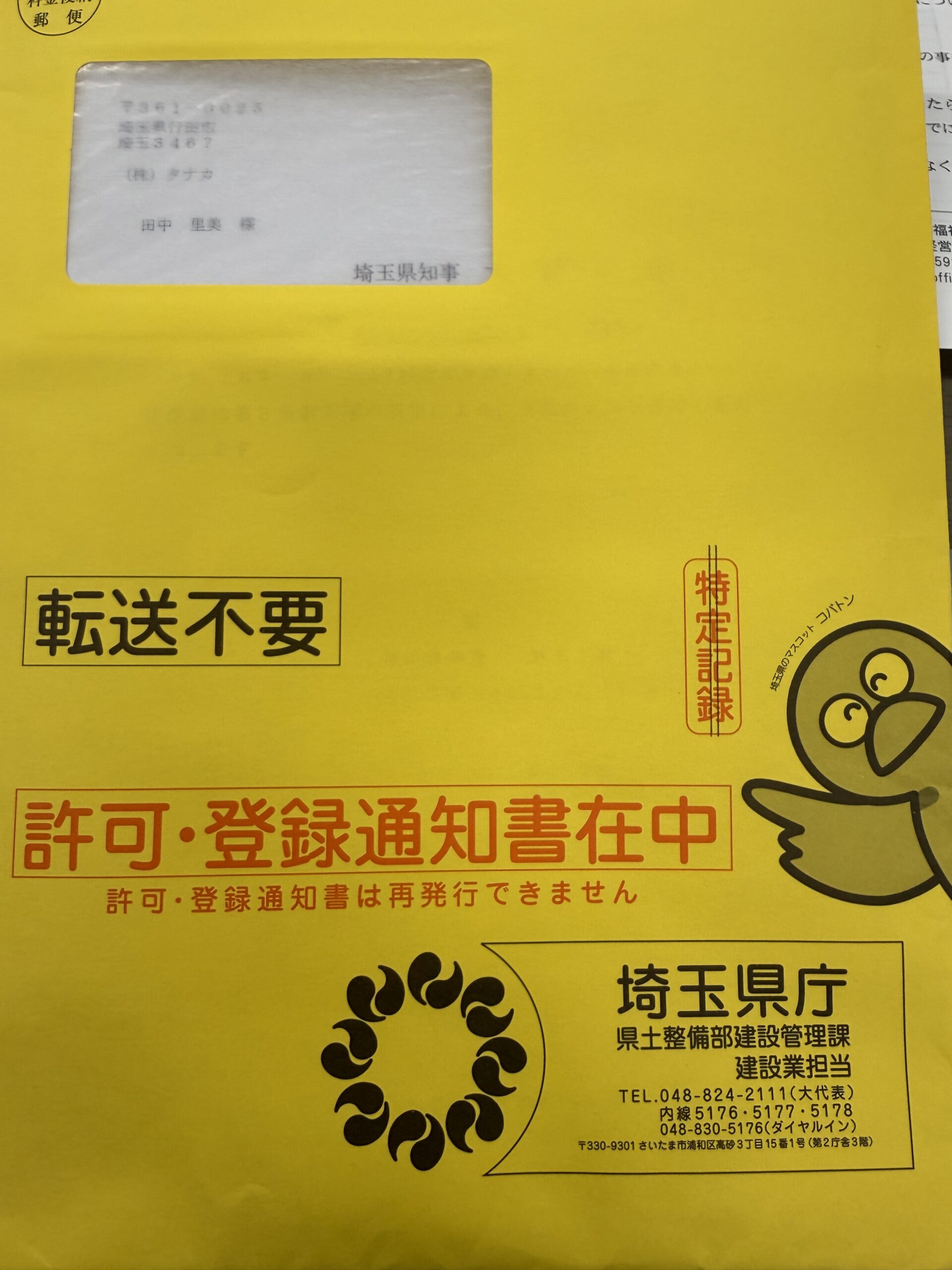 建設業許可証が届きました 2026.03.24 日々のタナカ 新しい建設業許可証が届きました。 弊社は埼玉県知事許可なので、コバトンの封筒に入ってます。 沢山の書類を揃えなければならないのですが、行政書士事務所の先生にご協力いただき 今回も無事に更新することができました。 表彰されました。
